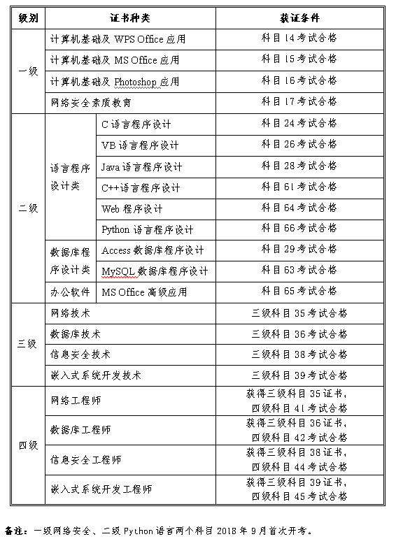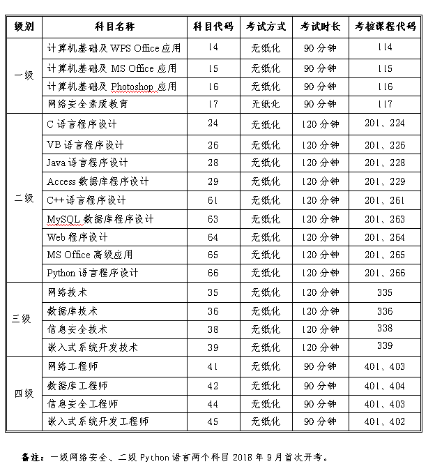 全國計算機等級考試科目設置(2018版)