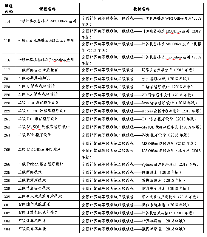全國計算機等級考試課程、教材列表(2018版)